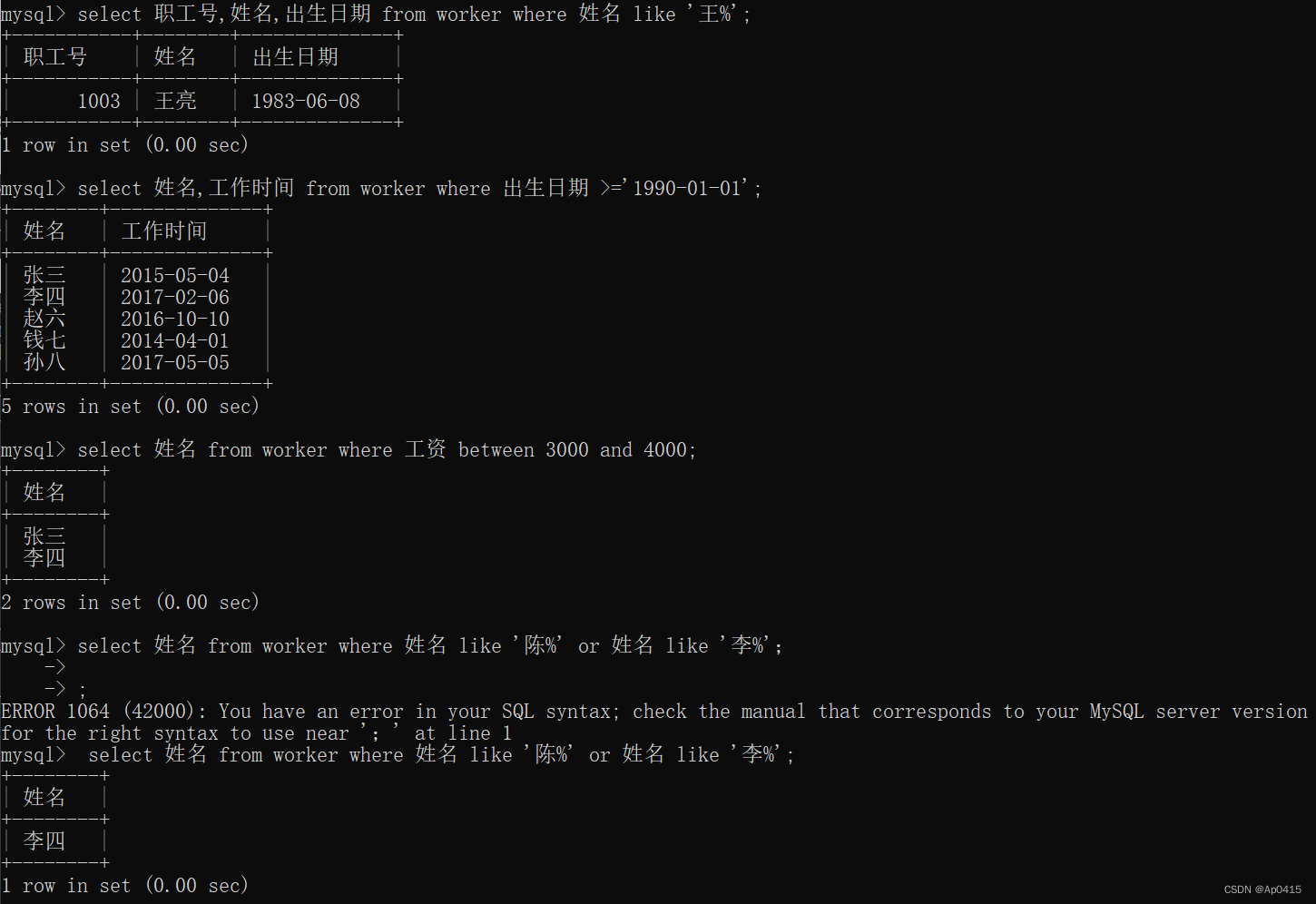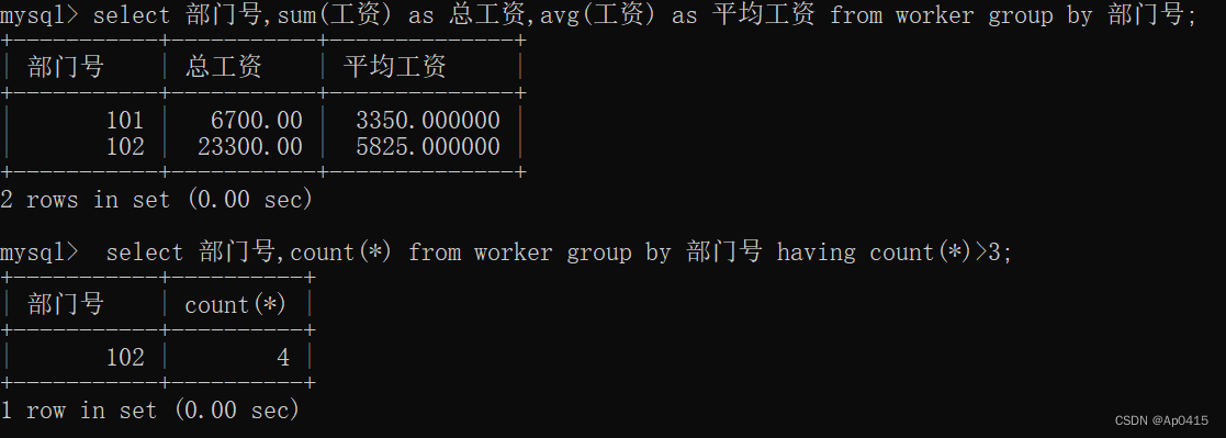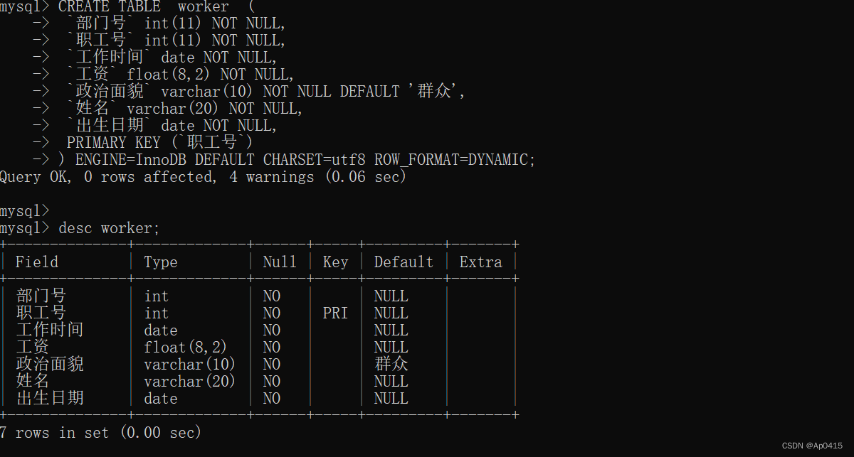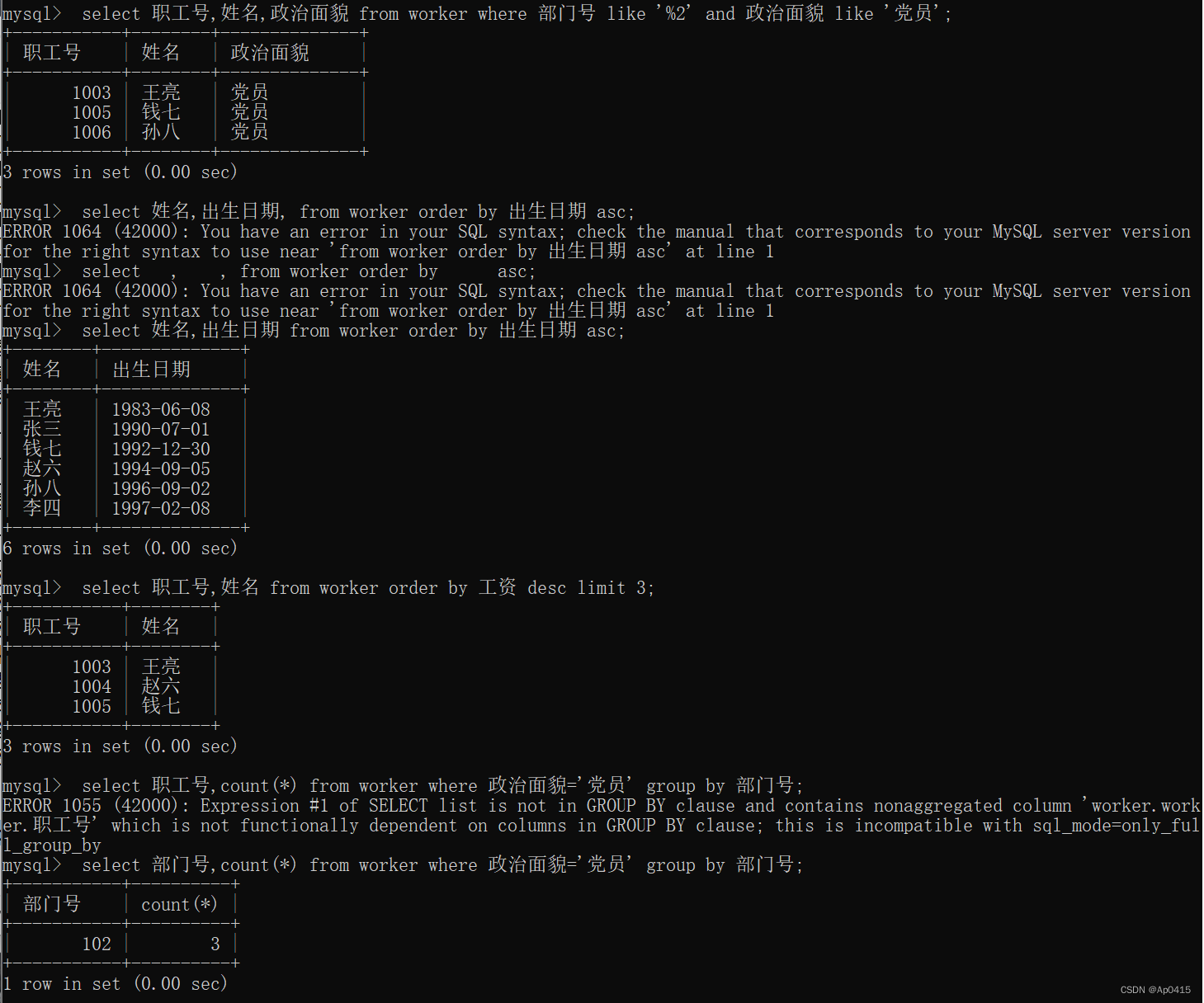 素材: 表名:worker-- 表中字段均为中文,比如 部门号 工资 职工号 参加工作 等