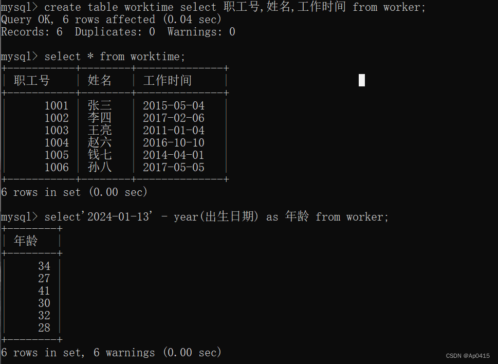 6、创建一个只有职工号、姓名和参加工作的新表,名为工作日期表。
