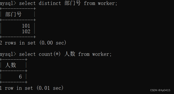 2、查询所有职工所属部门的部门号,不显示重复的部门号。
