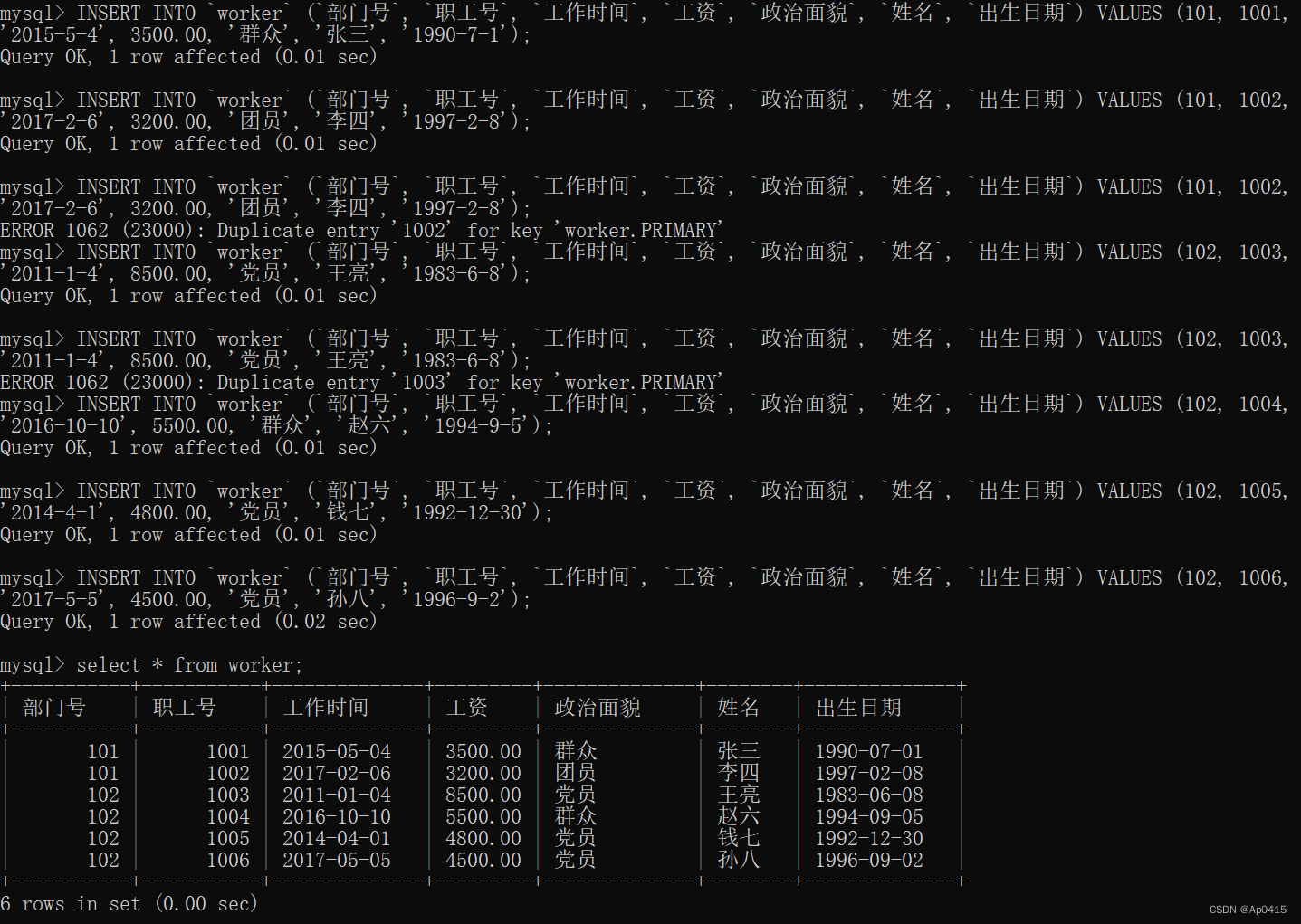 INSERT INTO `worker` (`部门号`, `职工号`, `工作时间`, `工资`, `政治面貌`, `姓名`, `出生