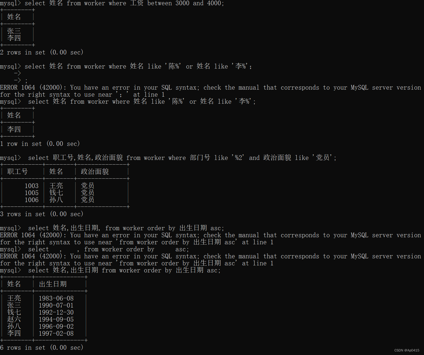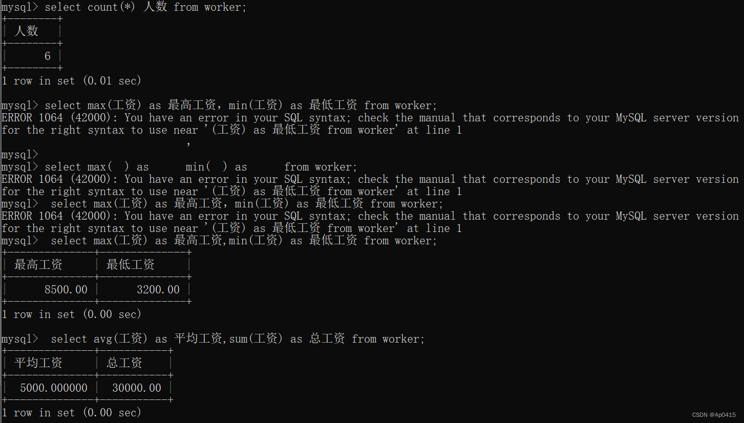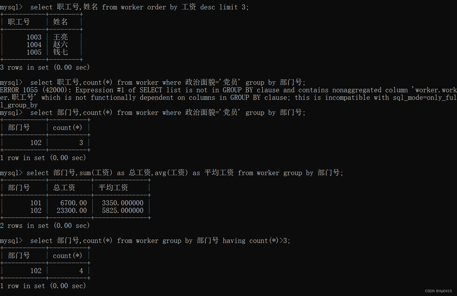素材: 表名:worker-- 表中字段均为中文,比如 部门号 工资 职工号 参加工作 等