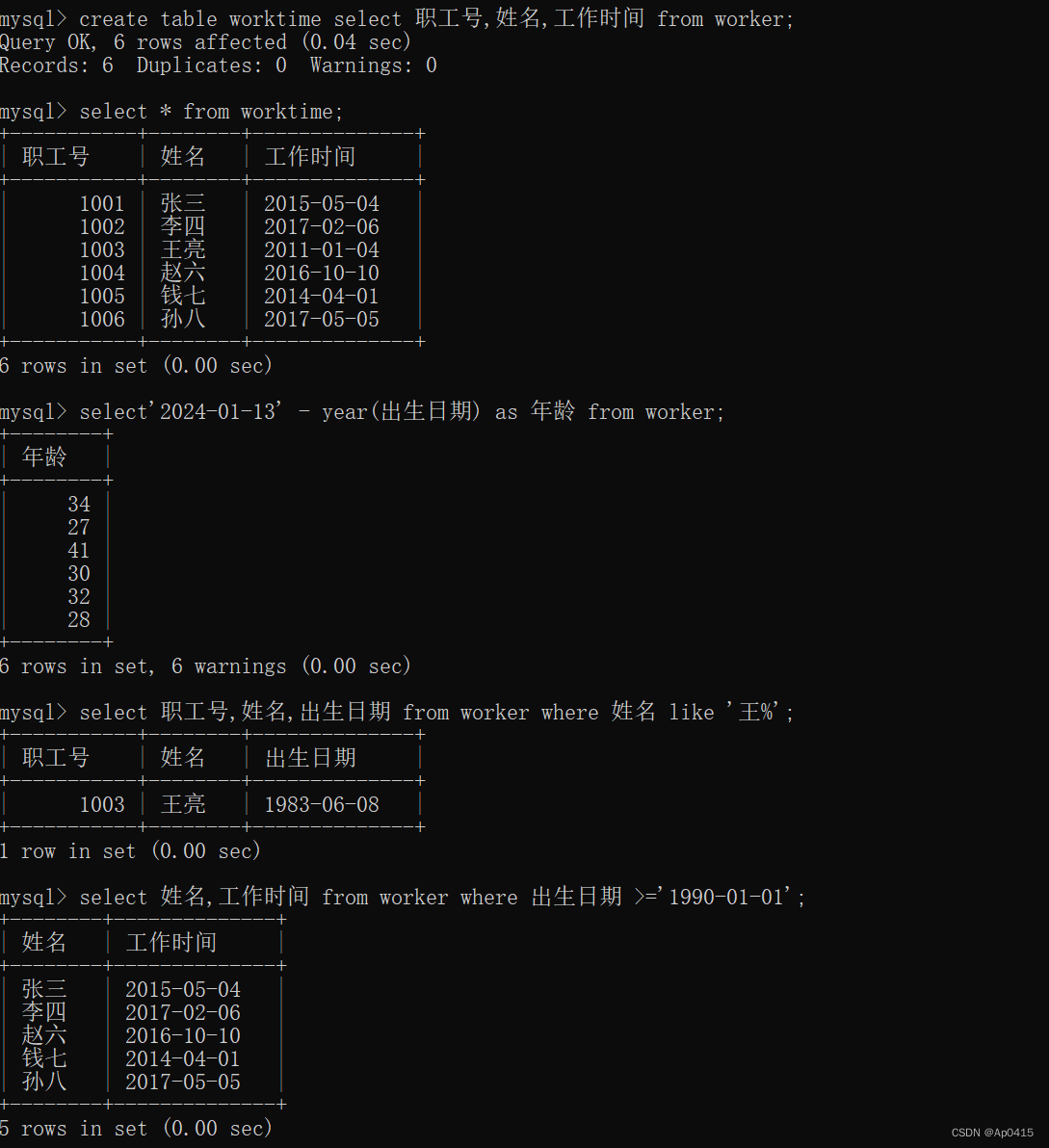6、创建一个只有职工号、姓名和参加工作的新表,名为工作日期表。