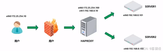 架构流程:用户通过防火墙进入网络内部,访问到HAPROXY,然后HAPROXY通过设定将流量发送到后端的Real Server 主机上、