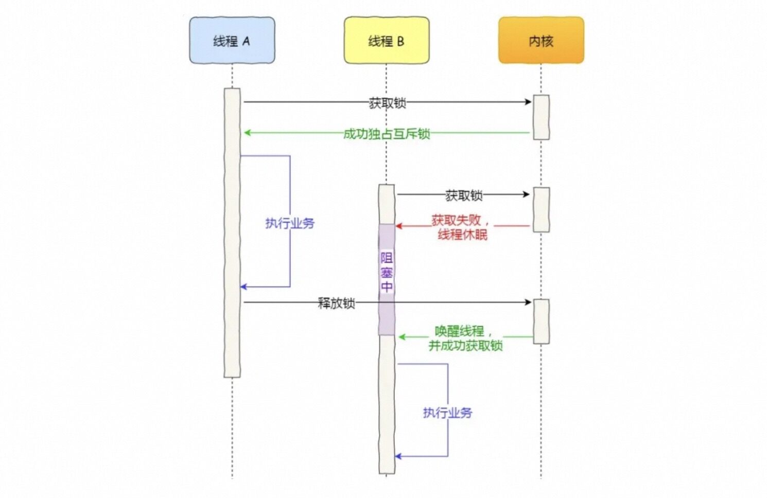 互斥锁加锁失败而阻塞是由操作系统内核实现的,当加锁失败后,内核将线程置为睡眠状态,等到锁被释放后,内核会在合适的时机唤醒线程,当这个线程加锁成功后就可以继续执行。具体的互斥锁行为可以参考下图: