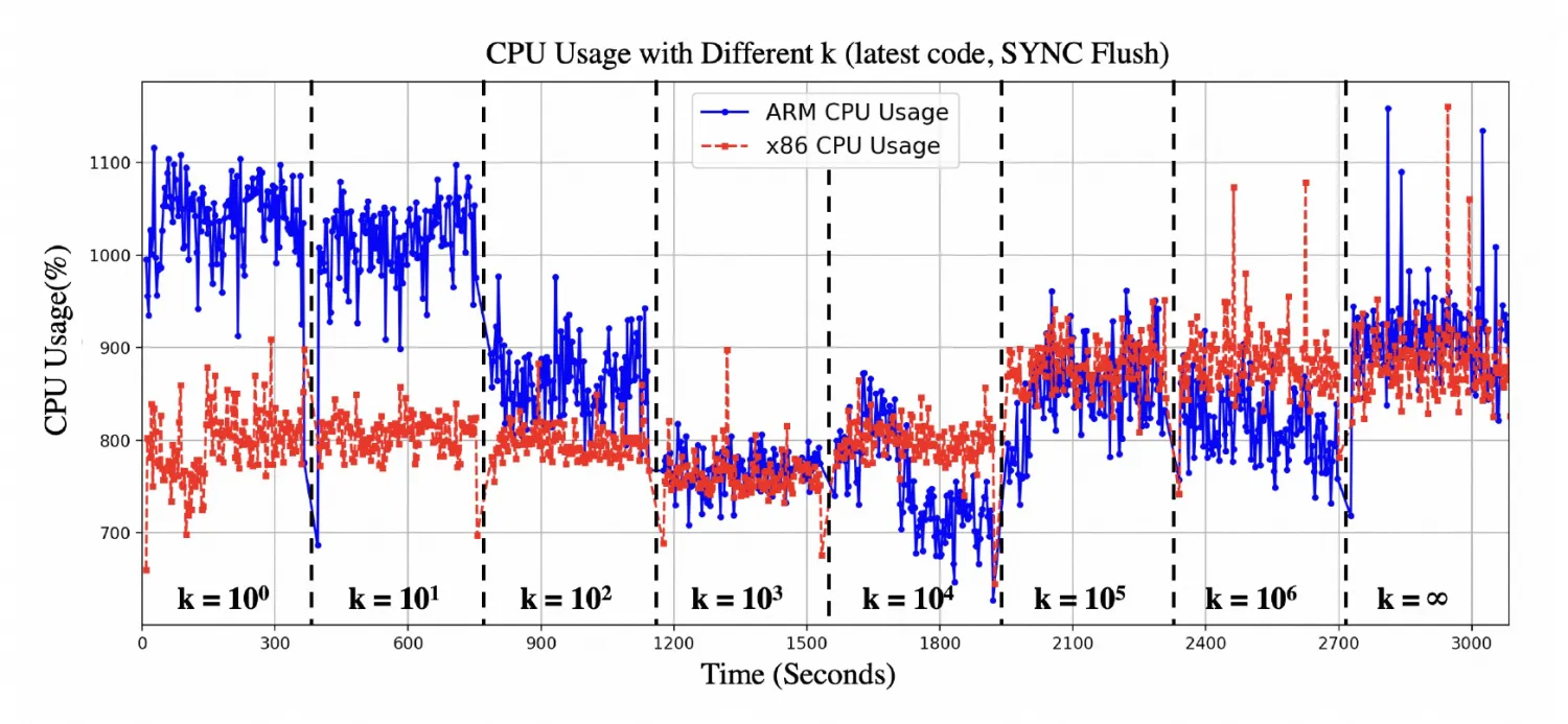 以 X86 架构,同步刷盘的行为为例。实验结果表明,在 k= 10^3 时,发送速度不仅达到峰值(155019.20),CPU 使用率也达到最低。这表明退避策略成功地节省了 CPU 资源。此时,CPU 支持更高的性能水平和较低的利用率水平,这表明性能瓶颈已经转移——例如,可能已经转移到了磁盘上。在表中可以观察到,在具有相同的 k(10^3)和配置参数(最新代码,SYNC 刷盘模式)的 ARM CPU 上,RocketMQ 的性能提高了 10.4%。此外,如上图所示,当 k= 10^3 时,CPU 使用量大幅下降,从平均超过 1000% 下降到 750% 左右。资源消耗的减少表明,减轻其他系统瓶颈可能会导致更显著的性能提高。