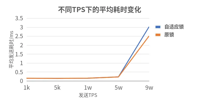 不过,尾部的请求情况一般代表竞争极为激烈时的极端场景。可能有的消息经过多次锁请求尝试但是都未获得锁,因此导致了这种长尾效应。我们还测试了在不同 TPS 下的平均发送耗时情况,发现在竞争极为严重时,我们的 ABS 锁由于自带了一定自旋,所以会让平均延时大约提升 0.5 ms。使用时需要仔细衡量具体场景,以确定是否在高压时开启自适应锁。