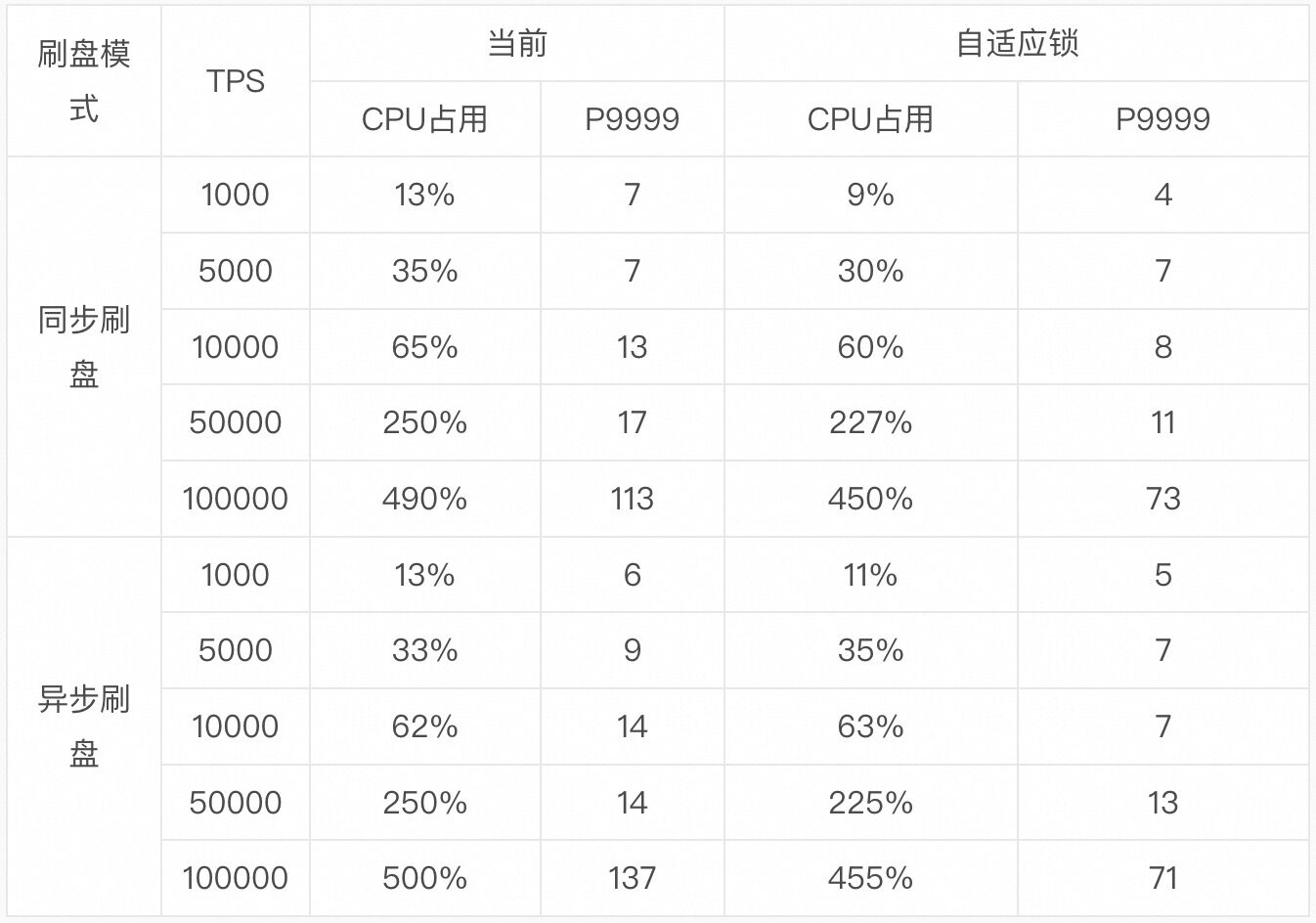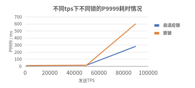 可以看到,在不同 TPS 下,我们的自适应锁都能带来更优质的 P9999,有效降低了发送过程中由于锁争抢带来的耗时。