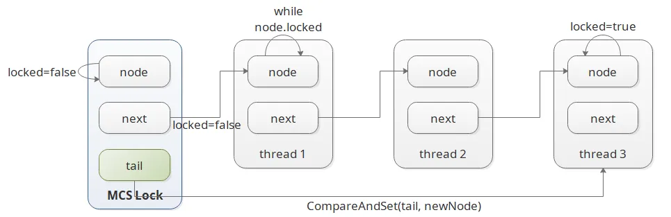 与 CLH 相似,但是时在本地自旋,更改下一个节点的状态。解决了 CLH 在 NUMA 系统架构中获取 locked 域状态内存过远的问题