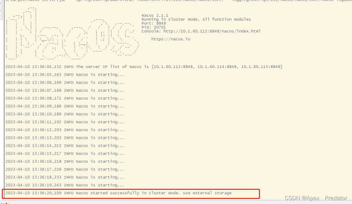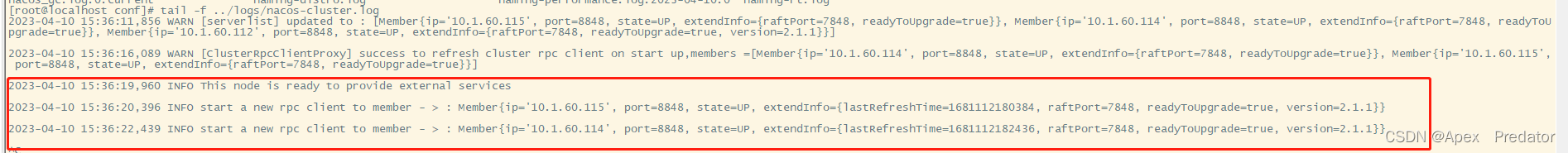 tail -f /etc/nacos/nacos/logs/nacos-cluster.log