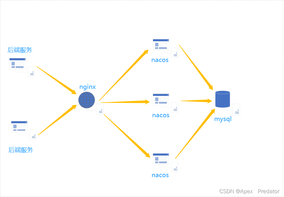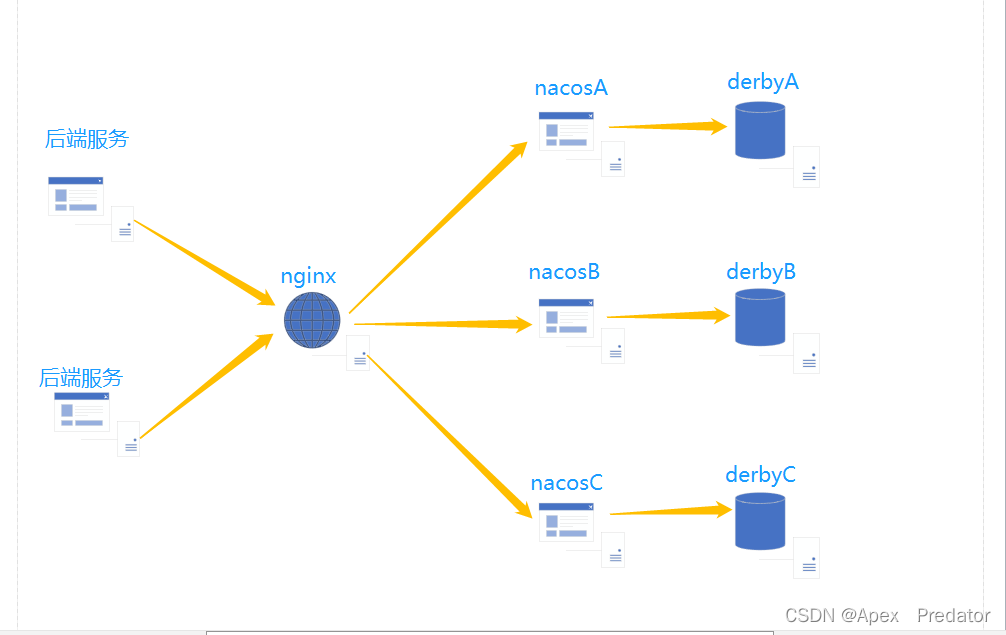 不推荐使用nacos自带的嵌入式数据库derby,因为需要保证数据的一致性,本集群使用mysql数据库,因为nacos自带的嵌入式数据库derby是每个nacos服务一个数据库,集群中有三台nacos服务主机,就相当于有三个数据库,但是用mysql数据库的话就是三台主机公用一个数据库,如下图所示