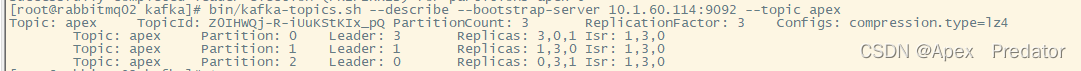 查看apex主题的详细信息,其中包含topic id、isr列表、partition分区等信息