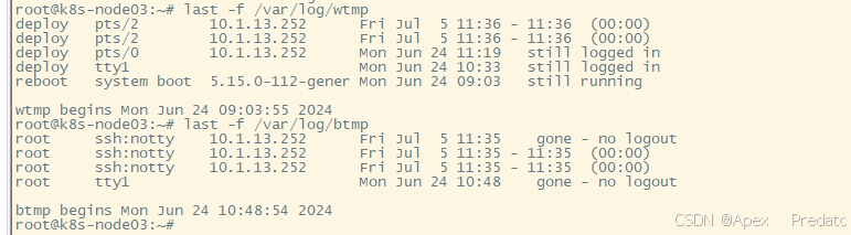 /var/log/wtmp:记录登录日志纪录所有到系统的登录和注销的用户