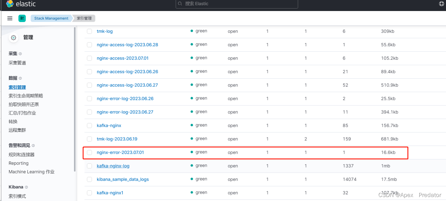 可以看到nginx生成报错日志后,elasticsearch 也自动创建了符合配置规则的索引,并将日志写入,查看一下日志数据