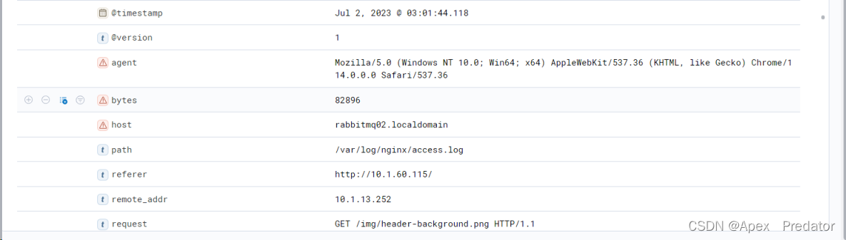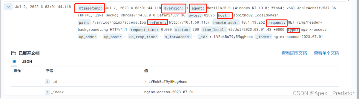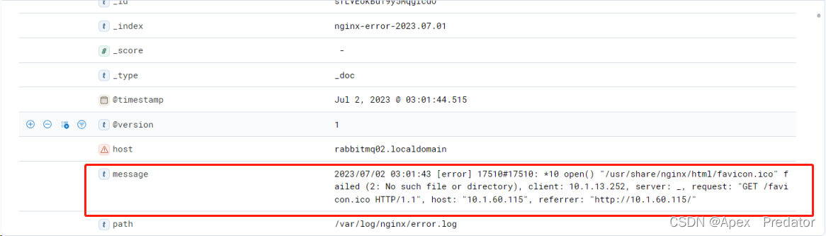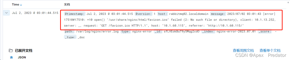 message字段就是nginx的error日志,因为日志不是json格式的原因,所以是没有字段的,只有一长条日志,若是需要将日志修改为json格式就需要用到logstash的filter去将日志更改为json格式