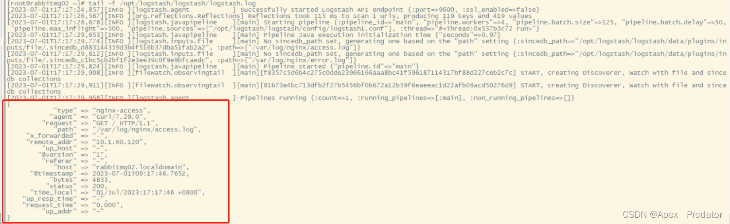 以上output配置中,可以先禁用输出到elasticsearch中,启用stdout配置项输出到日志中查看一下日志是否配置正确,使用该配置文件启动logstash服务