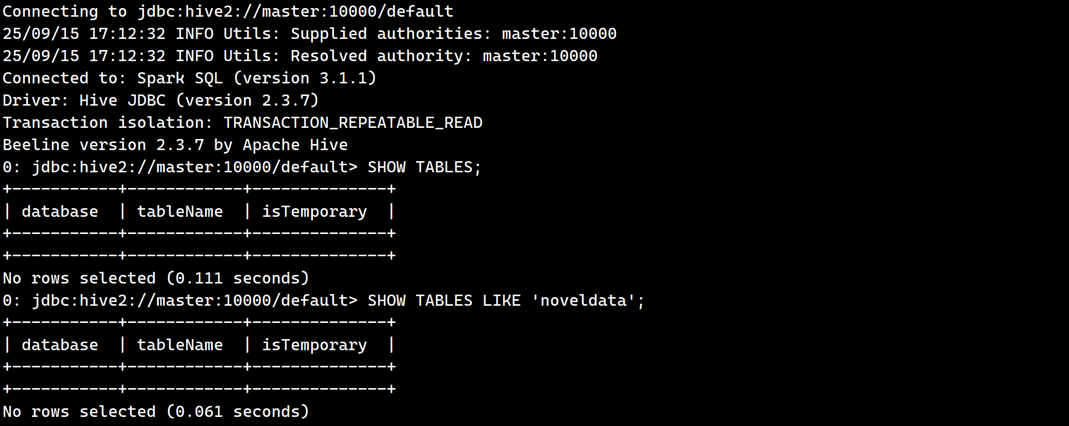 pyhive.exc.OperationalError: TExecuteStatementResp(status=TStatus(statusCode=3, infoMessages=["*org.apache.hive.service.cli.HiveSQLException:Error running query: org.apache.spark.sql.AnalysisException: Table or view not found: noveldata; line 1 pos 14;\n'Project [*]\n+- 'UnresolvedRelation [noveldata], [], false\n:36:35", 'org.apache.spark.sql.hive.thriftserver.SparkExecuteStatementOperation:org$apache$spark$sql$hive$thriftserver$SparkExecuteStatementOperation$$execute:SparkExecuteStatementOperation.scala:361', 'org.apache.spark.sql.hive.thriftserver.SparkExecuteStatementOperation:runInternal:SparkExecuteStatementOperation.scala:249', 'org.apache.hive.service.cli.operation.Operation:run:Operation.java:278', 'org.apache.spark.sql.hive.thriftserver.SparkExecuteStatementOperation:org$apache$spark$sql$hive$thriftserver$SparkOperation$$super$run:SparkExecuteStatementOperation.scala:43', 'org.apache.spark.sql.hive.thriftserver.SparkOperation:$anonfun$run$1:SparkOperation.scala:44', 'scala.runtime.java8.JFunction0$mcV$sp:apply:JFunction0$mcV$sp.java:23', 'org.apache.spark.sql.hive.thriftserver.SparkOperation:withLocalProperties:SparkOperation.scala:78', 'org.apache.spark.sql.hive.thriftserver.SparkOperation:withLocalProperties$:SparkOperation.scala:62', 'org.apache.spark.sql.hive.thriftserver.SparkExecuteStatementOperation:withLocalProperties:SparkExecuteStatementOperation.scala:43', 'org.apache.spark.sql.hive.thriftserver.SparkOperation:run:SparkOperation.scala:44', 'org.apache.spark.sql.hive.thriftserver.SparkOperation:run$:SparkOperation.scala:42', 'org.apache.spark.sql.hive.thriftserver.SparkExecuteStatementOperation:run:SparkExecuteStatementOperation.scala:43', 'org.apache.hive.service.cli.session.HiveSessionImpl:executeStatementInternal:HiveSessionImpl.java:484', 'org.apache.hive.service.cli.session.HiveSessionImpl:executeStatement:HiveSessionImpl.java:460', 'sun.reflect.GeneratedMethodAccessor82:invoke::-1', 'sun.reflect.DelegatingMethodAccessorImpl:invoke:DelegatingMethodAccessorImpl.java:43', 'java.lang.reflect.Method:invoke:Method.java:498', 'org.apache.hive.service.cli.session.HiveSessionProxy:invoke:HiveSessionProxy.java:78', 'org.apache.hive.service.cli.session.HiveSessionProxy:access$000:HiveSessionProxy.java:36', 'org.apache.hive.service.cli.session.HiveSessionProxy$1:run:HiveSessionProxy.java:63', 'java.security.AccessController:doPrivileged:AccessController.java:-2', 'javax.security.auth.Subject:doAs:Subject.java:422', 'org.apache.hadoop.security.UserGroupInformation:doAs:UserGroupInformation.java:1730', 'org.apache.hive.service.cli.session.HiveSessionProxy:invoke:HiveSessionProxy.java:59', 'com.sun.proxy.$Proxy36:executeStatement::-1', 'org.apache.hive.service.cli.CLIService:executeStatement:CLIService.java:281', 'org.apache.hive.service.cli.thrift.ThriftCLIService:ExecuteStatement:ThriftCLIService.java:457', 'org.apache.hive.service.rpc.thrift.TCLIService$Processor$ExecuteStatement:getResult:TCLIService.java:1557', 'org.apache.hive.service.rpc.thrift.TCLIService$Processor$ExecuteStatement:getResult:TCLIService.java:1542', 'org.apache.thrift.ProcessFunction:process:ProcessFunction.java:38', 'org.apache.thrift.TBaseProcessor:process:TBaseProcessor.java:39', 'org.apache.hive.service.auth.TSetIpAddressProcessor:process:TSetIpAddressProcessor.java:53', 'org.apache.thrift.server.TThreadPoolServer$WorkerProcess:run:TThreadPoolServer.java:310', 'java.util.concurrent.ThreadPoolExecutor:runWorker:ThreadPoolExecutor.java:1149', 'java.util.concurrent.ThreadPoolExecutor$Worker:run:ThreadPoolExecutor.java:624', 'java.lang.Thread:run:Thread.java:748', "*org.apache.spark.sql.AnalysisException:Table or view not found: noveldata; line 1 pos 14;\n'Project [*]\n+- 'UnresolvedRelation [noveldata], [], false\n:65:29", 'org.apache.spark.sql.catalyst.analysis.package$AnalysisErrorAt:failAnalysis:package.scala:42', 'org.apache.spark.sql.catalyst.analysis.CheckAnalysis:$anonfun$checkAnalysis$1:CheckAnalysis.scala:113', 'org.apache.spark.sql.catalyst.analysis.CheckAnalysis:$anonfun$checkAnalysis$1$adapted:CheckAnalysis.scala:93', 'org.apache.spark.sql.catalyst.trees.TreeNode:foreachUp:TreeNode.scala:183', 'org.apache.spark.sql.catalyst.trees.TreeNode:$anonfun$foreachUp$1:TreeNode.scala:182', 'org.apache.spark.sql.catalyst.trees.TreeNode:$anonfun$foreachUp$1$adapted:TreeNode.scala:182', 'scala.collection.immutable.List:foreach:List.scala:392', 'org.apache.spark.sql.catalyst.trees.TreeNode:foreachUp:TreeNode.scala:182', 'org.apache.spark.sql.catalyst.analysis.CheckAnalysis:checkAnalysis:CheckAnalysis.scala:93', 'org.apache.spark.sql.catalyst.analysis.CheckAnalysis:checkAnalysis$:CheckAnalysis.scala:90', 'org.apache.spark.sql.catalyst.analysis.Analyzer:checkAnalysis:Analyzer.scala:155', 'org.apache.spark.sql.catalyst.analysis.Analyzer:$anonfun$executeAndCheck$1:Analyzer.scala:176', 'org.apache.spark.sql.catalyst.plans.logical.AnalysisHelper$:markInAnalyzer:AnalysisHelper.scala:228', 'org.apache.spark.sql.catalyst.analysis.Analyzer:executeAndCheck:Analyzer.scala:173', 'org.apache.spark.sql.execution.QueryExecution:$anonfun$analyzed$1:QueryExecution.scala:73', 'org.apache.spark.sql.catalyst.QueryPlanningTracker:measurePhase:QueryPlanningTracker.scala:111', 'org.apache.spark.sql.execution.QueryExecution:$anonfun$executePhase$1:QueryExecution.scala:143', 'org.apache.spark.sql.SparkSession:withActive:SparkSession.scala:772', 'org.apache.spark.sql.execution.QueryExecution:executePhase:QueryExecution.scala:143', 'org.apache.spark.sql.execution.QueryExecution:analyzed$lzycompute:QueryExecution.scala:73', 'org.apache.spark.sql.execution.QueryExecution:analyzed:QueryExecution.scala:71', 'org.apache.spark.sql.execution.QueryExecution:assertAnalyzed:QueryExecution.scala:63', 'org.apache.spark.sql.Dataset$:$anonfun$ofRows$2:Dataset.scala:98', 'org.apache.spark.sql.SparkSession:withActive:SparkSession.scala:772', 'org.apache.spark.sql.Dataset$:ofRows:Dataset.scala:96', 'org.apache.spark.sql.SparkSession:$anonfun$sql$1: