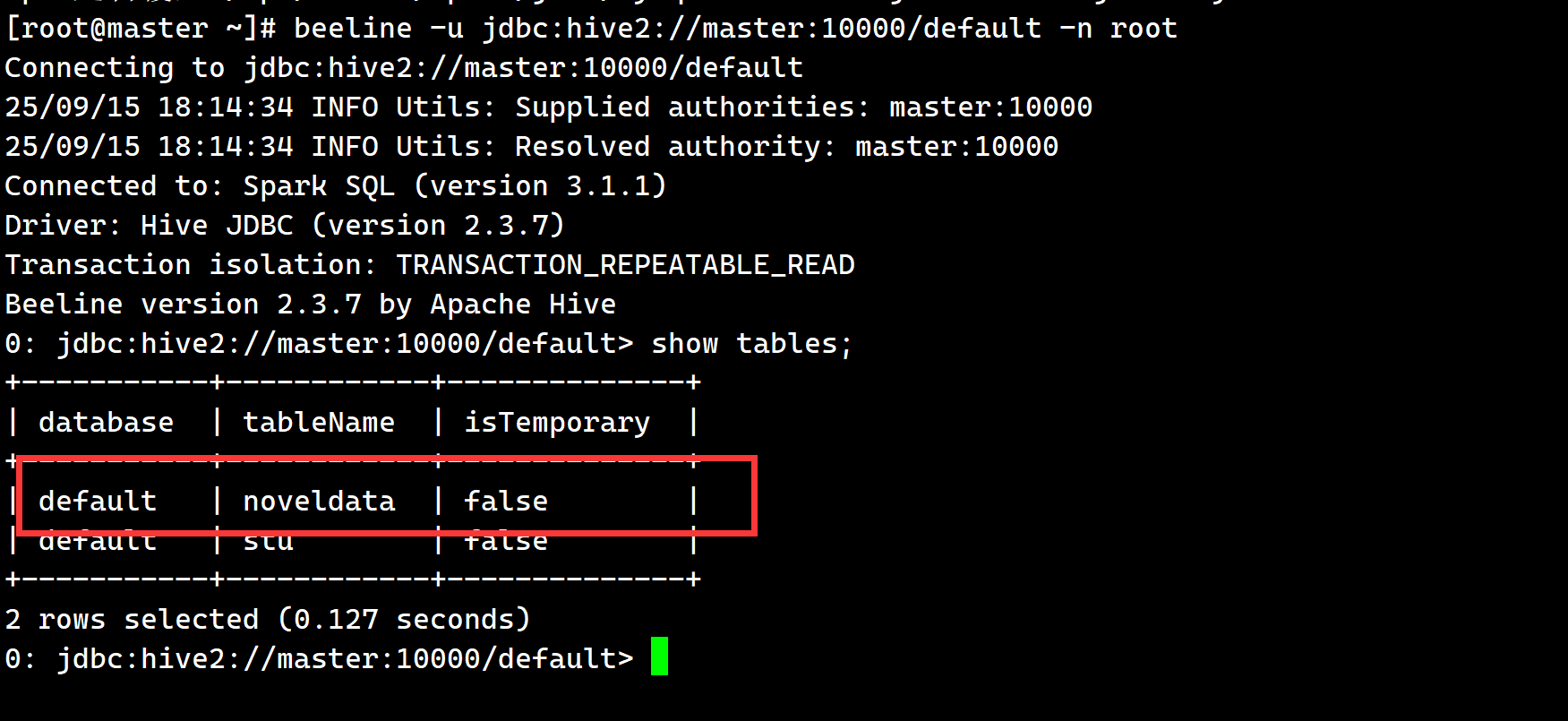 0: jdbc:hive2://master:10000/default> SHOW TABLES;