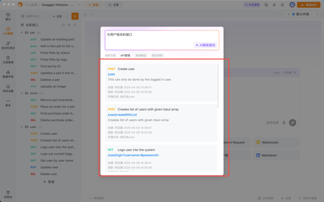 当 API 数量成指数级增长时,接口管理方式必须从“文档管理”进化为“语义检索”。Apipost 的智能搜索功能,正是这一转变的缩影。它不追求“炫技式的 AI”,而是切中一个日常、高频、痛点明显的场景: