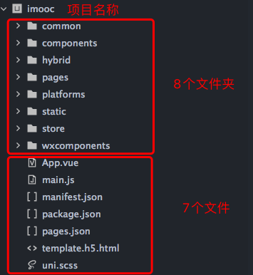 创建项目时,选择 Hello uni-app 项目模板,项目创建完成后,会帮我们生成下面的项目目录。其中有几个文件与 uni-ui 项目目录重复了,作用都是一样的。