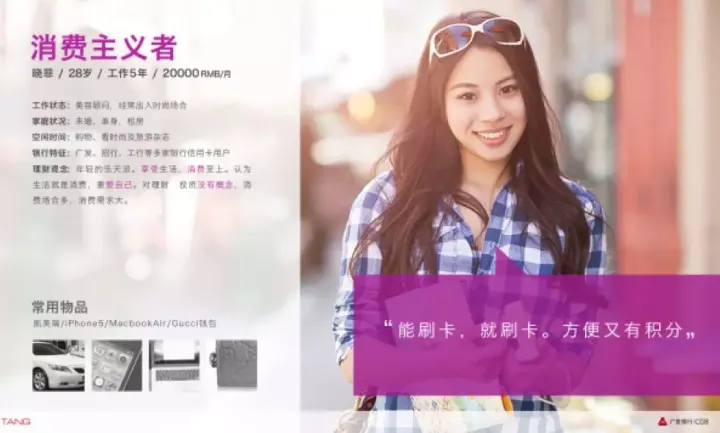 那么如何去了解呢?实际工作中最基础的几个用户调研方法是:用户访谈、用户观察、问卷。通过这些方法你可以收集到用户的基本信息,接下来就可以对其进行分类了。分类后可以进一步做一个事情,就是制定用户画像(下图就是一个用户画像)。