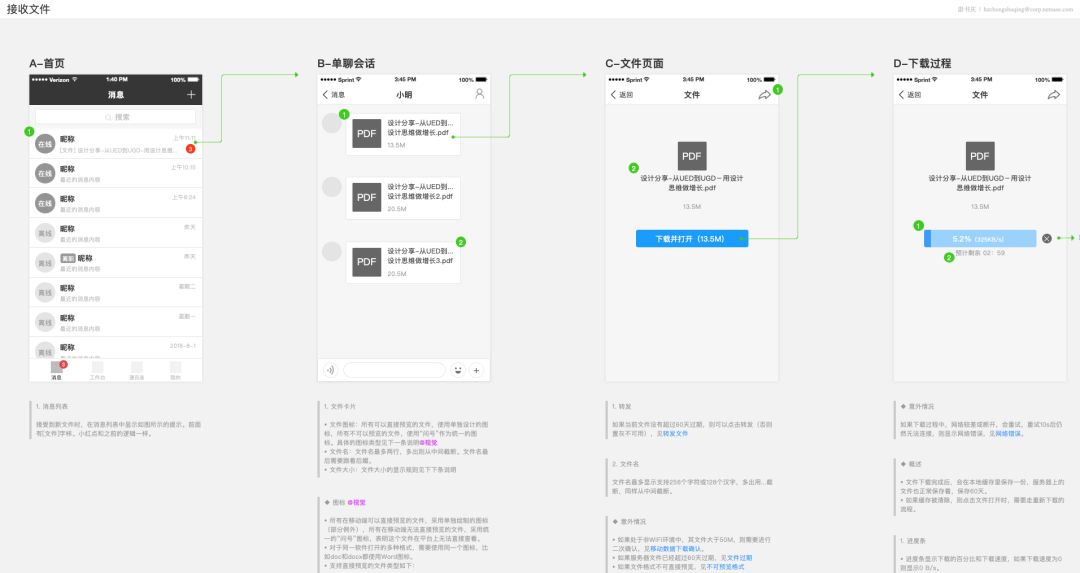 在交互稿中,展示一个功能的方式往往是“描述其交互流程”。比如在聊天APP中“接收文件”的交互流程可以描述为:点开消息→看到文件→点击下载→下载完成并打开。如下图所示: