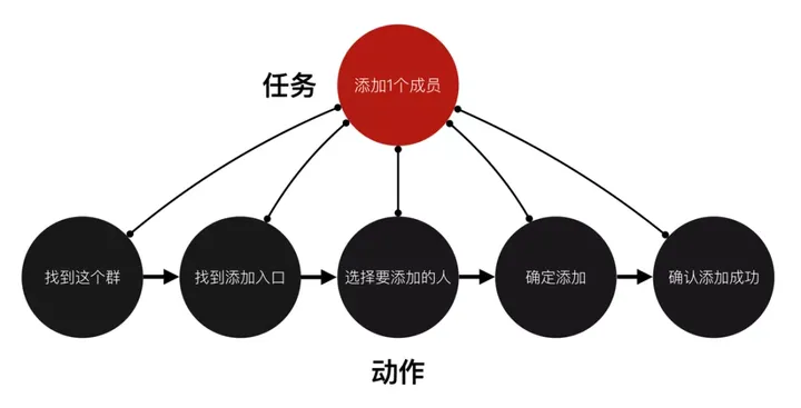 举个例子,如下图。比如我们做一个“群聊”的功能,群聊功能中有一个“添加群成员”的小功能。我们可以把“添加1个成员”看做是一个“任务”,用户想要完成这个任务,就必须有一系列“动作”。