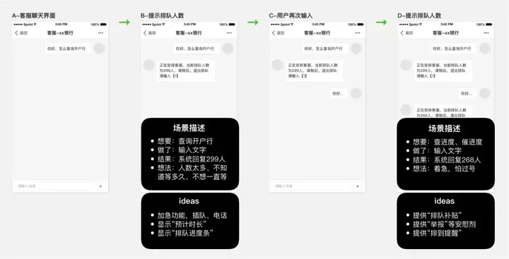为了更易理解,我将“场景”应用到了上面提到的银行APP的例子中,描述了一下用户场景并提出了一些idea,如下图所示。你也可以把自己代入到这个场景中,看是否能体会到“场景”这个工具的奥妙。
