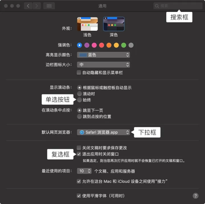 控件就是界面上最小的有效单元,比如下图中的“搜索框”、“单选按钮”、“复选框”、“下拉框”。