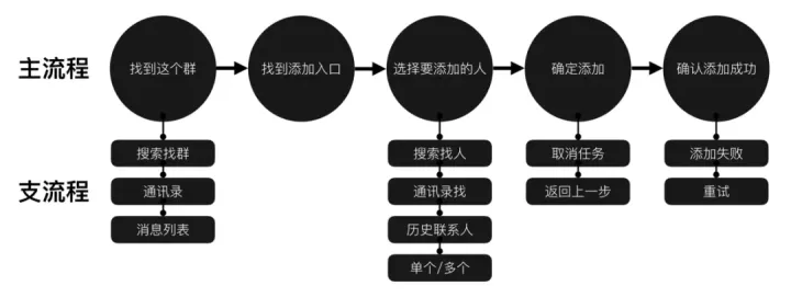 实际的交互流程会比这个例子复杂很多,不仅仅有“一条主流程”,还会有很多“支流程”。比如上述例子中,用户“找到群”的方式其实有很多,可以通过搜索,可以通过通讯录,也可以通过消息列表。