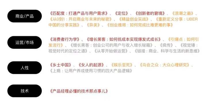 这些专业能力的学习相对复杂,且不是“入门阶段”所应该优先接触的,所以笔者只介绍一些学习方法,不做具体的解释分析。下面笔者推荐这些专业能力的相关书籍(红色是优先学习的,橙色是建议学习的,灰色是选择学习的)。