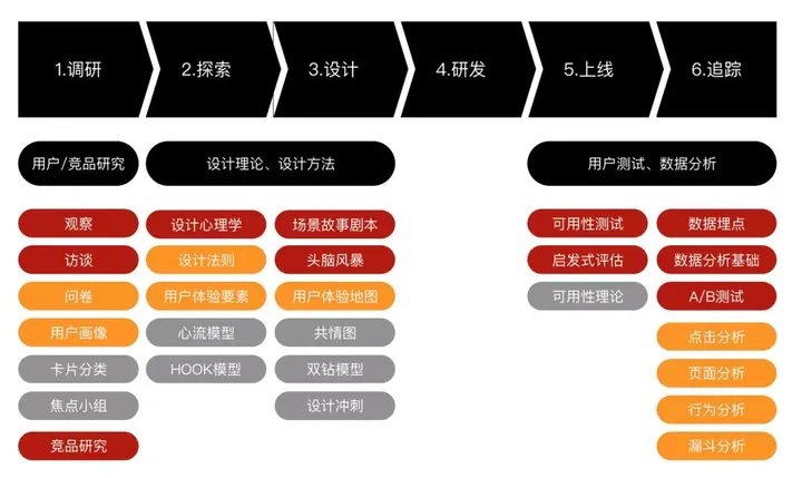 注意这里我所说的专业能力都是在实际工作中常用的,而不是全量的专业能力。下图中我将这些专业能力按照产品的研发流程做一下归类(红色是优先学习的,橙色是建议学习的,灰色是选择学习的):