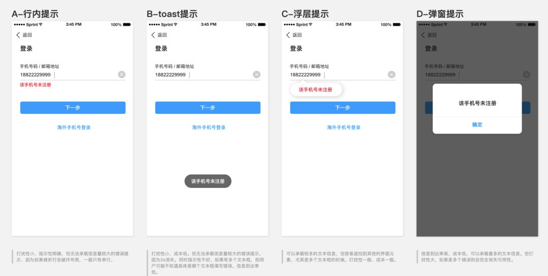 举个例子(下图),当用户输入手机号错误的时候,需要给用户一个错误提示,提示方式所用的控件可以有很多种:弹窗、toast、行内提示、气泡提示。