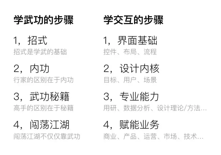 那么相对有体系的学习步骤是怎样的呢?这里笔者用“学武功”做一个类比: