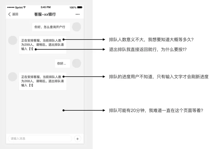 过了十几分钟,笔者有点不耐烦,于是又输入了一个“你好”。系统又给了一个同样的回复,只是排队的人数刷新了一下。这个例子中的控件、布局、流程都没有问题,但用户使用过程却会很痛苦,问题出在哪里呢?