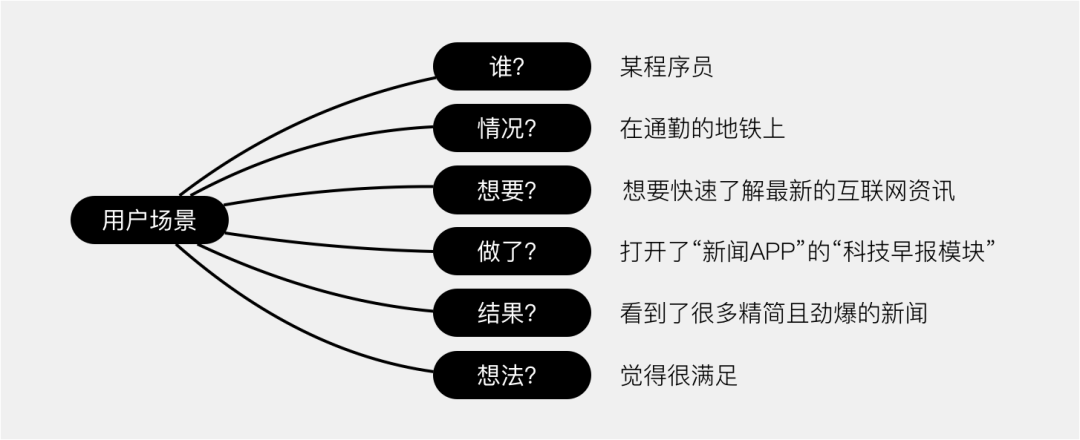 一般而言,我们都会将“场景”和“用户”、“目标”整合到一起描述,也就是常说的“用户场景”。用户场景的通用结构是:谁?在什么情况下?想要什么?做了什么?结果如何?他的想法如何?下图中举了一个用户看新闻的例子,可以帮助理解什么是用户场景。
