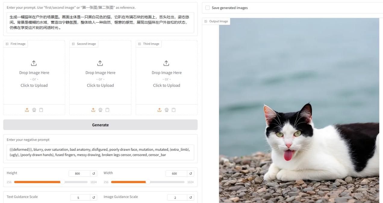 我们直接使用一段中文提示词,来测试图片生成功能:“生成一幅猫咪在户外的场景图。画面主体是一只黑白花色的猫,它趴在布满石块的地面上,舌头吐出,姿态悠闲。背景是模糊的水域,营造出宁静氛围,整体给人一种自然、惬意的感觉,展现出猫咪在户外放松的状态,仿佛在享受这片刻的闲适时光。”
