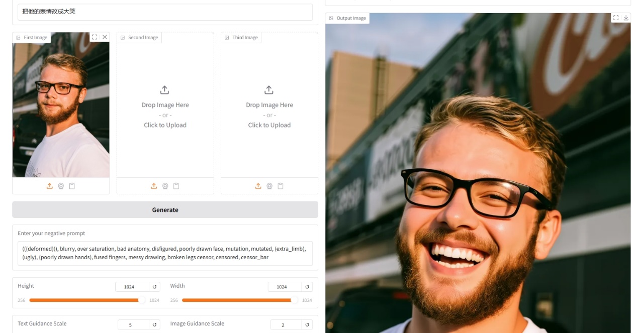 接下来是表情修改场景。我们使用系统自带的sample图片进行测试,看到生成图片很好地保留了人物的发色、胡子、背景图片的细节不变。(注:生成图片尺寸与原图一致,本文考虑图片观看效果,所以仅截取了部分区域,下同。)
