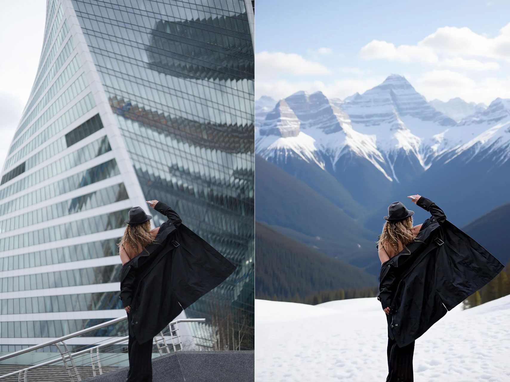 首先,我们指示OmniGen2基于左图主体人物不变,将背景更换为雪山。可以看到,除了部分细节略显塑料(比如雪山山脉的走势有些生硬,人物的右手放大后有些幻觉感)之外,图片能够做到整体可用。背景更换场景,OmniGen2算是过关。