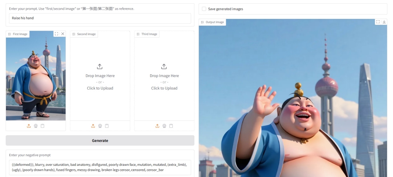 再看看动作调整。这次使用非常口语化的英文提示词“Raise his hand”,2分钟后可以看到,生成图片效果不错,手已经举起来了,并且没有违和感,手部细节也做到了零幻觉。