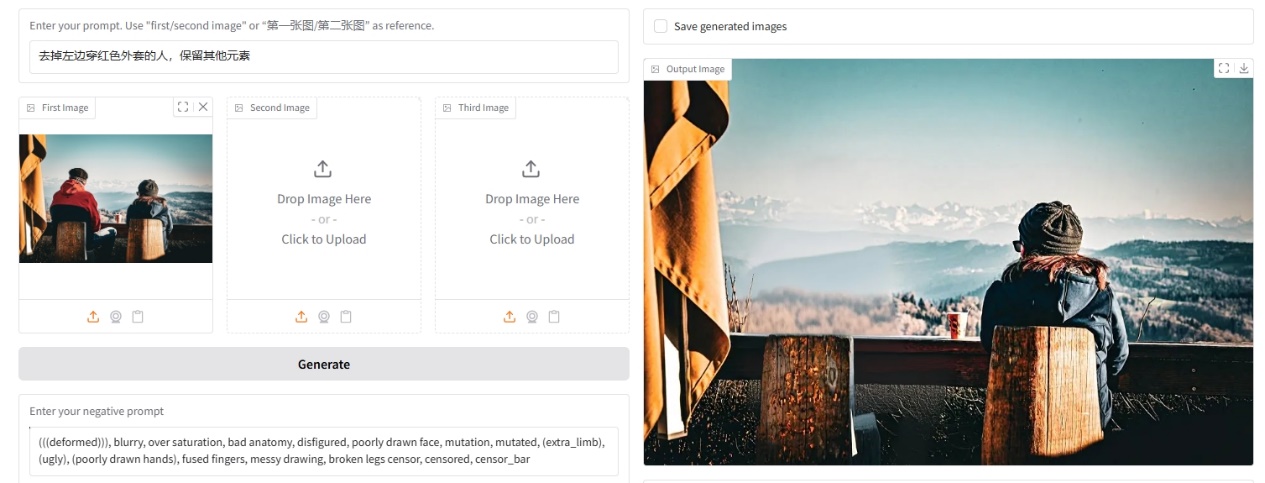物体增删方面,通过提示词,要求AI去掉左侧穿红色外套的人。从成片来看,勉强能够达到效果。这里也有一个小tips:原始图片的清晰度非常影响生成质量,这里上传的原始图片清晰度不高,因此生成图片有点糊化。
