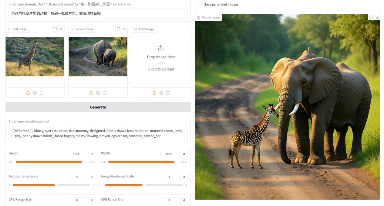 另外就是此前网上吹爆的多主体合影功能,也不得不说OmniGen2主打一个“已读乱回”,虽然勉为其难识别出了图1是长颈鹿、图2是大象(背影),但是合成图片首先在比例上就非常错误,同时充满塑料感。