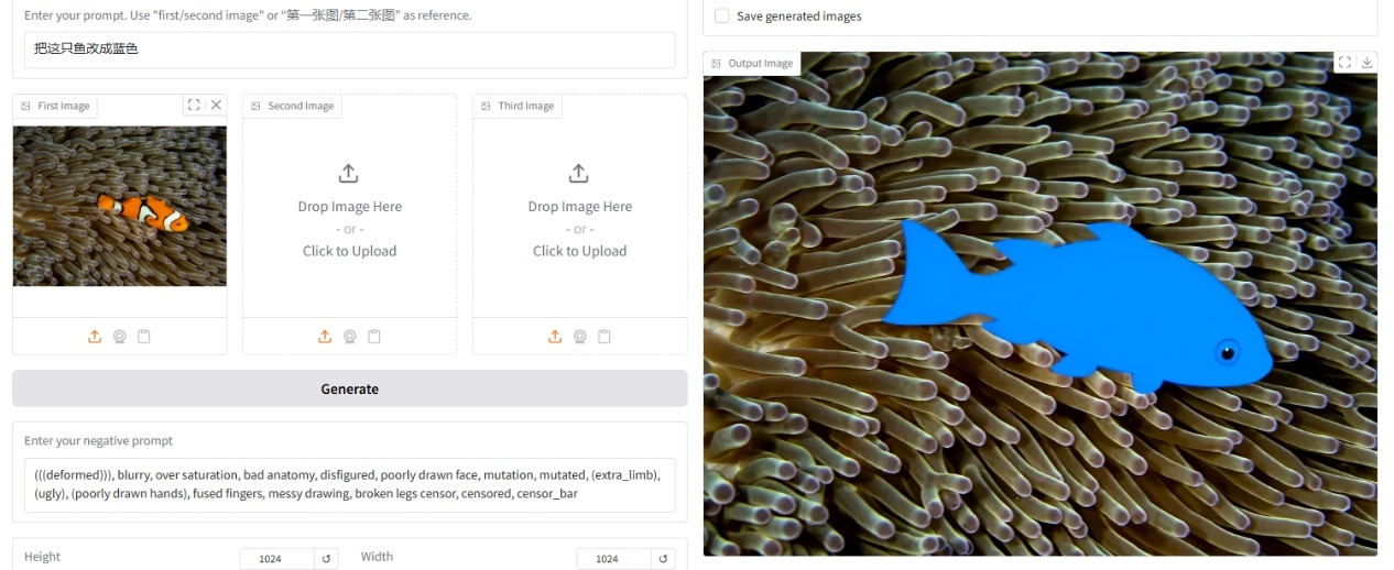 颜色修改方面,OmniGen2的表现就显得有些魔幻。被要求把画面中的鱼改成蓝色,虽然说确实从字面上完成了任务,但是毫无活人感,可以说直接扑街。