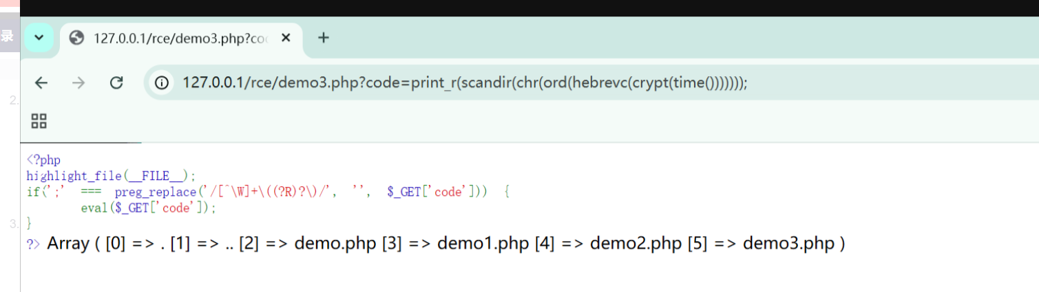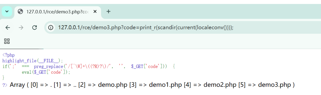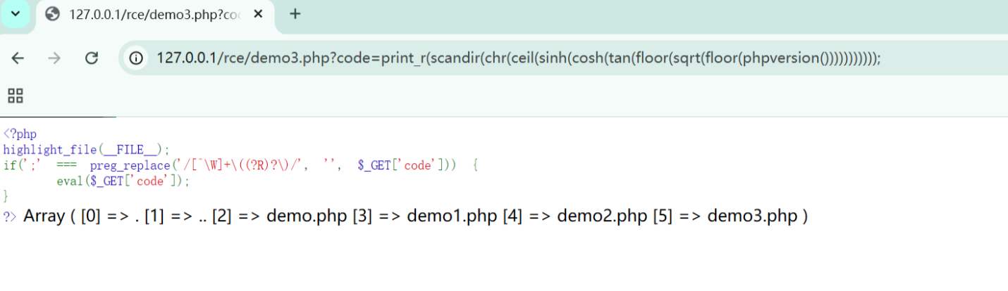 preg_replace('/[^\W]+\((?R)?\)/', '', $_GET['code']):匹配并替换掉无参数的函数调用,确保 $_GET['code'] 仅剩 keval($_GET['code']):执行传入的 code 参数。