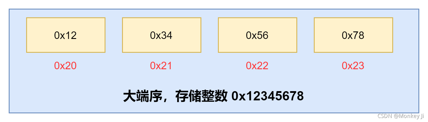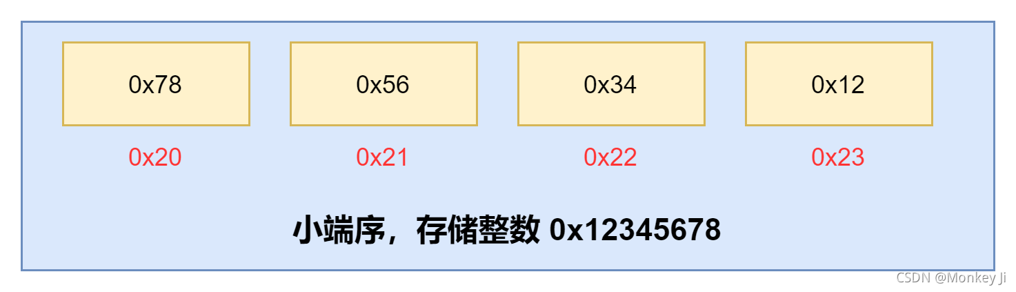 比如在0x20开始的地址中保存4字节int类型数 0x12345678 ,