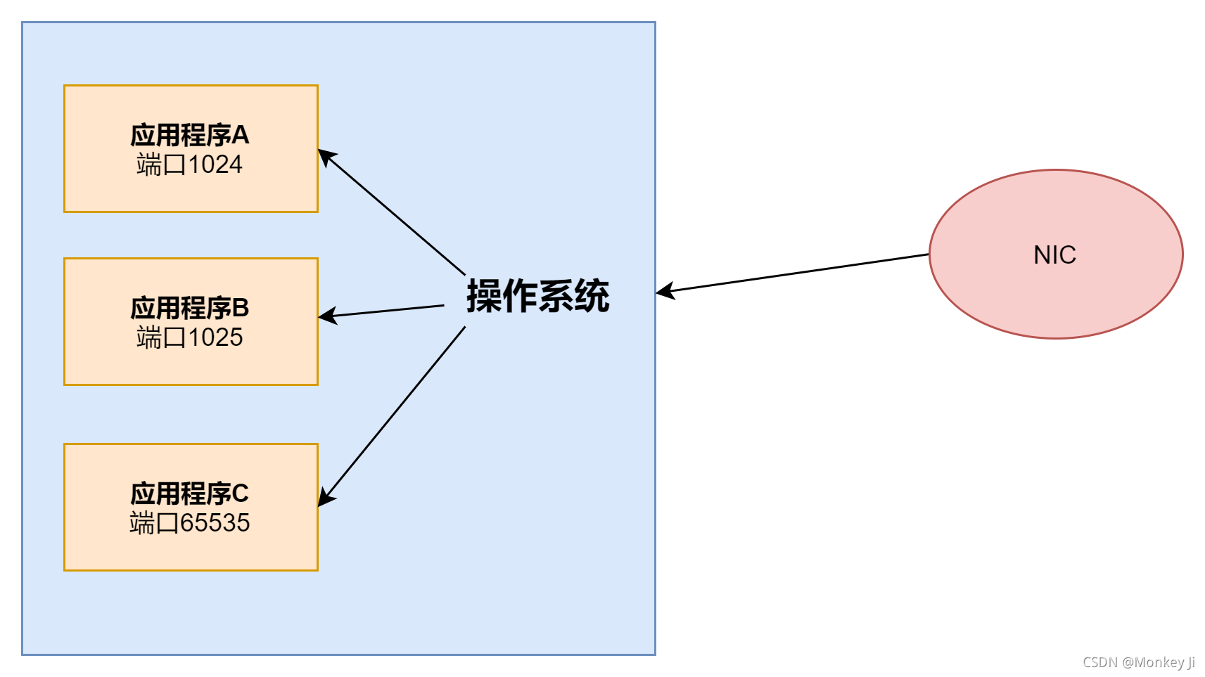 计算机的NIC(Network Interface Card,网络接口卡) 数据传输设备,通过NIC向计算机内部传输数据时会用到IP。 操作系统 负责把传递到内部的数据 通过端口号 分配给套接字。
