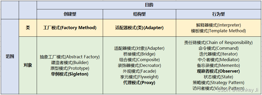二、按照 目的准则 和 范围准则 对设计模式进行分类: