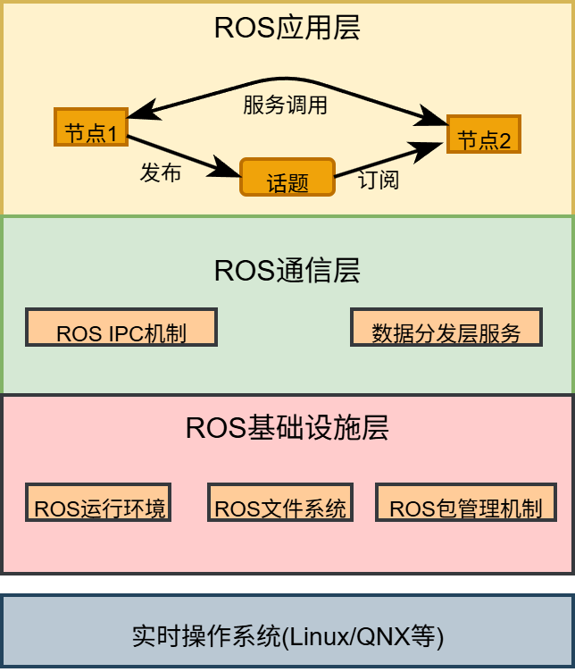 基础设施层 包括ROS中的Python、C++等运行环境、 ROS文件系统 与 ROS包管理机制等。