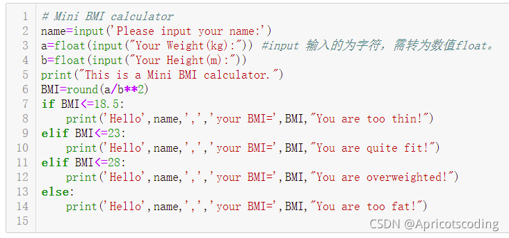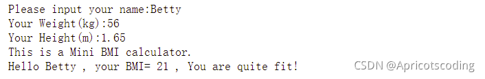 需求:编写程序,输入姓名和体重、身高,计算并打印出BMI数值并按以下分类提示: