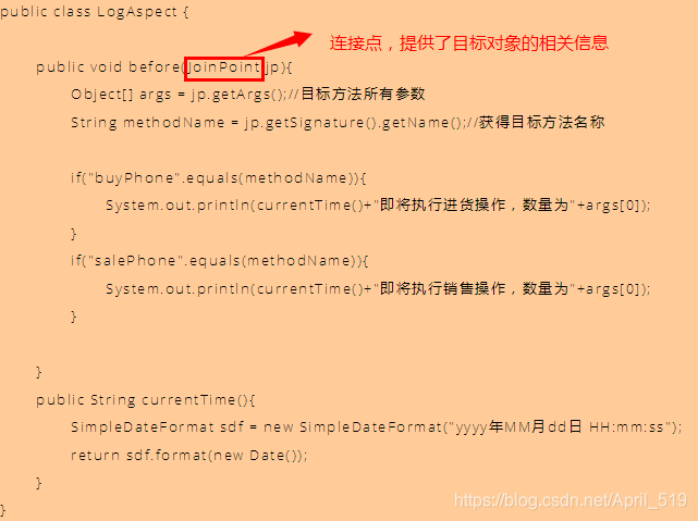 连接点对象可以在切面类的通知方法中以参数的形式使用,其包含了以下方法来访问连接点的一些信息: