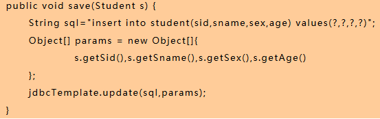 JdbcTemplate的update()方法,两个参数分别为要执行的sql语句和sql中内置的参数。
